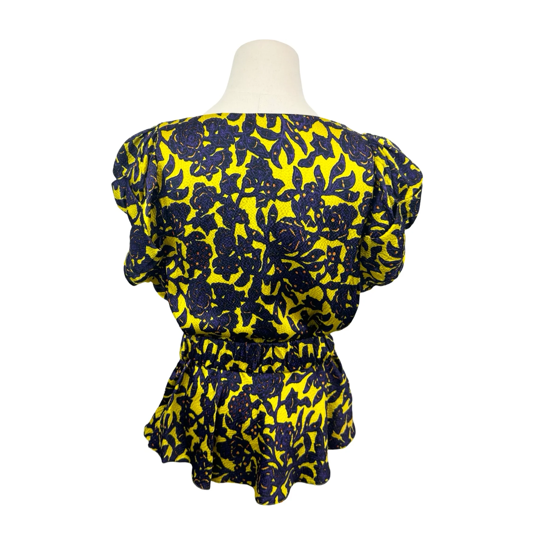 - V-neckline floral top with twisted detail, elastic back waist and side zip closure.