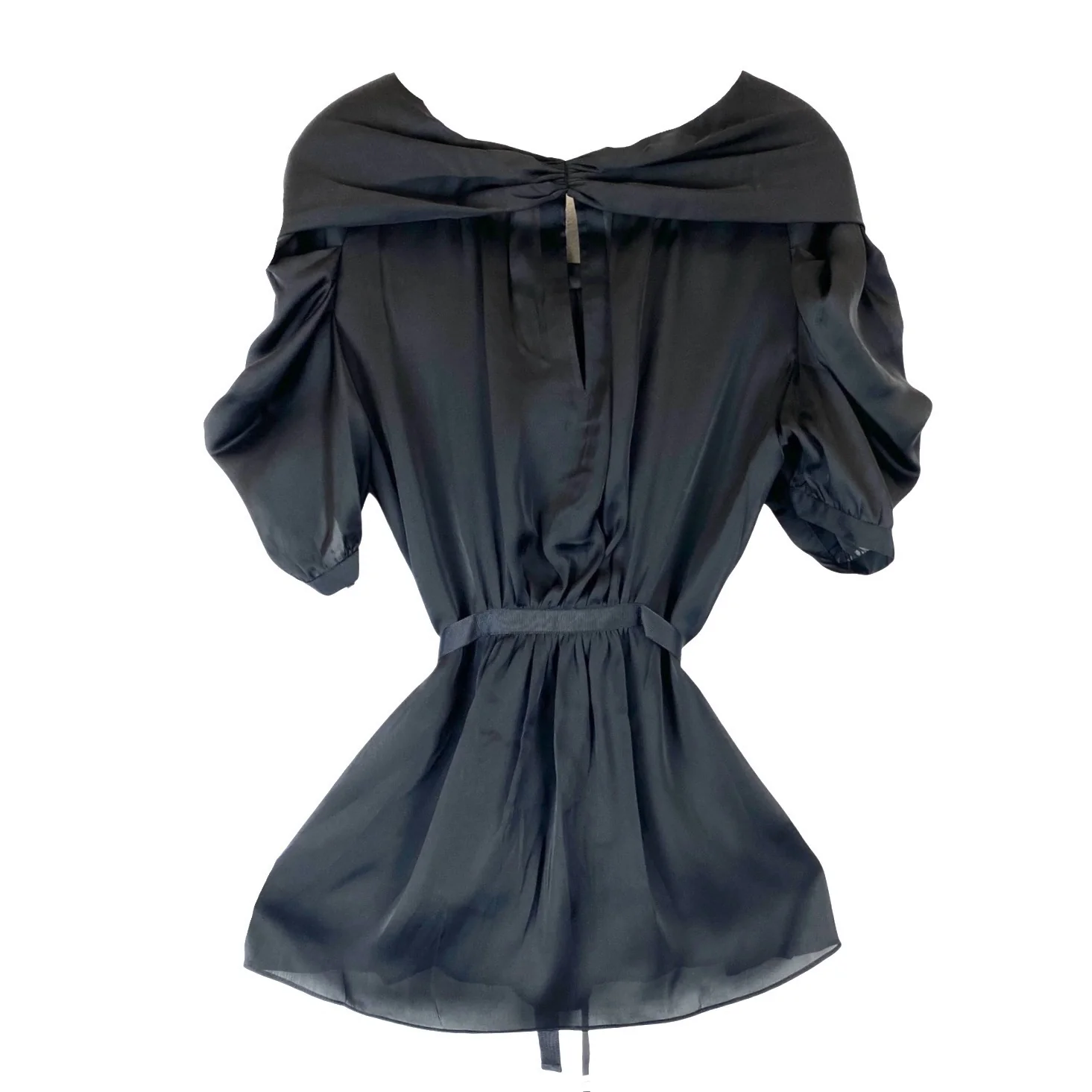 - Sheer puff sleeve blouse with cowl neck detail and contrast tie belt