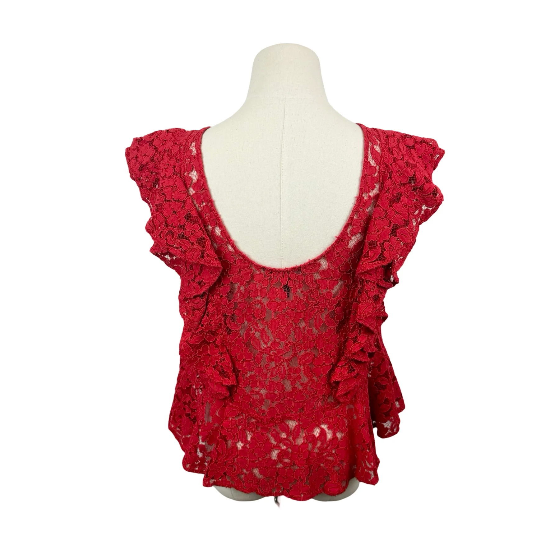 - Short sleeve lace top with ruffle hem. Unlined. Missing self tie at waist.