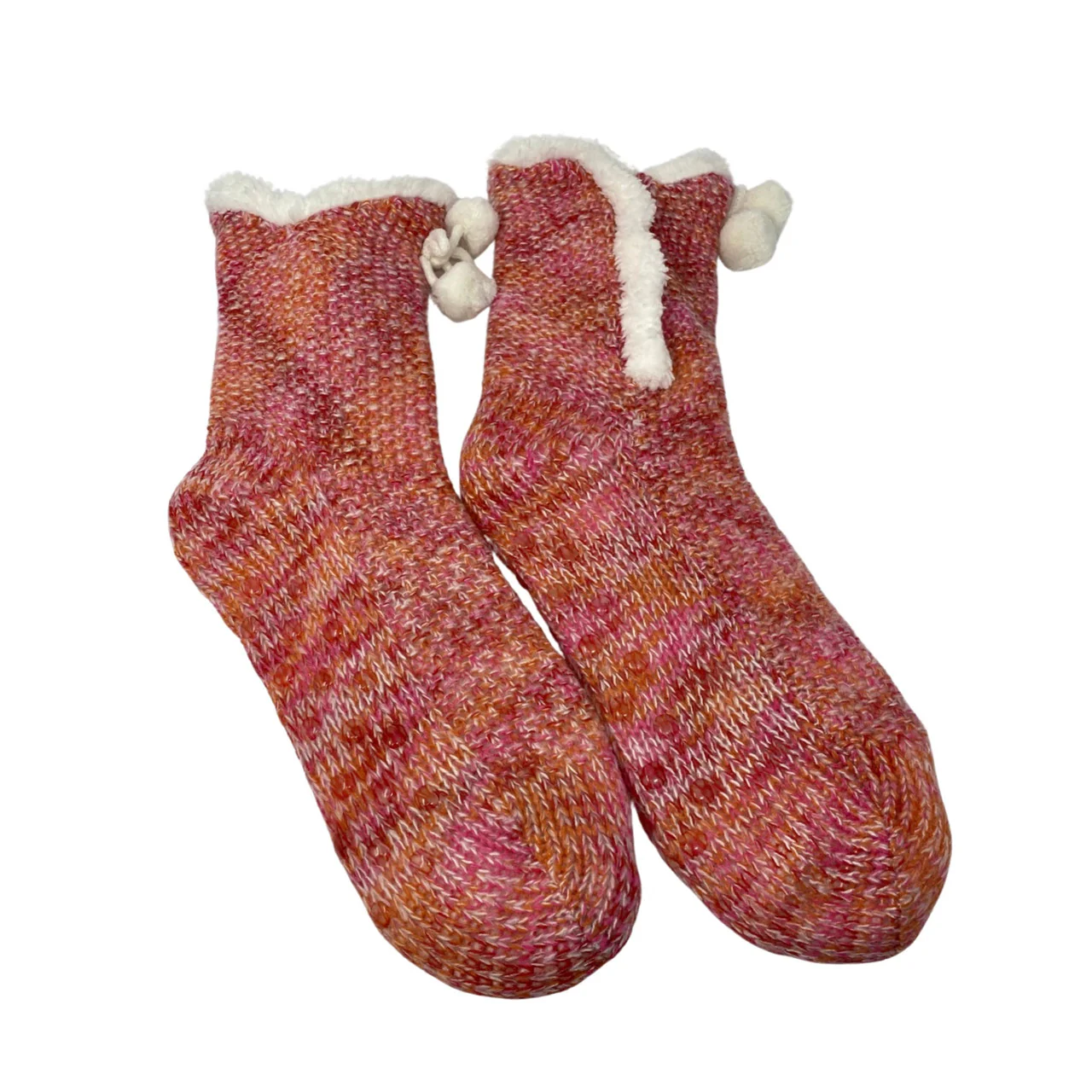 - Knitted socks with a tie and pom pom detail near the top. Sherpa lining and rubber grip bottom.