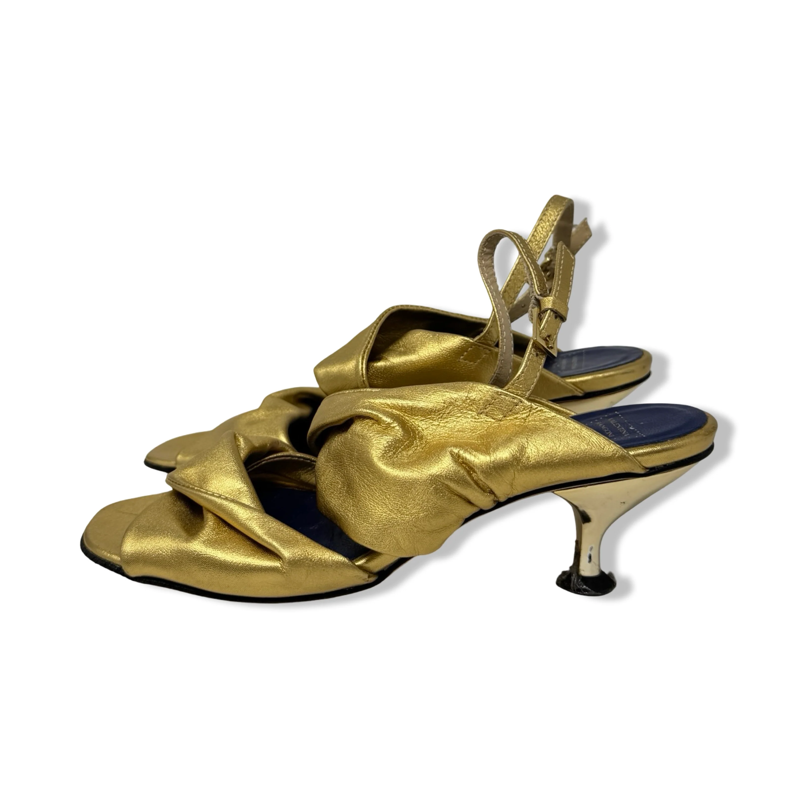 - Slip on gold tone heels with fold-over detail and buckle closure on back. Some signs of wear